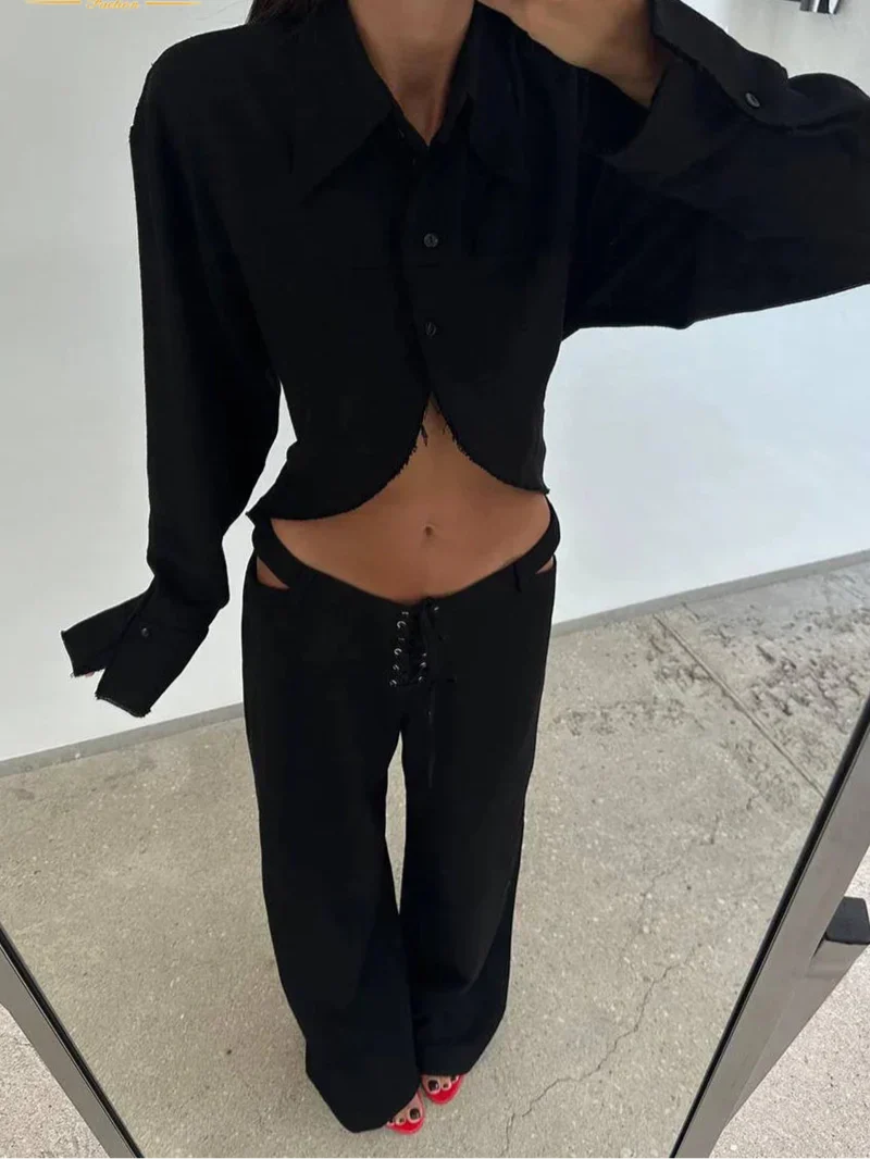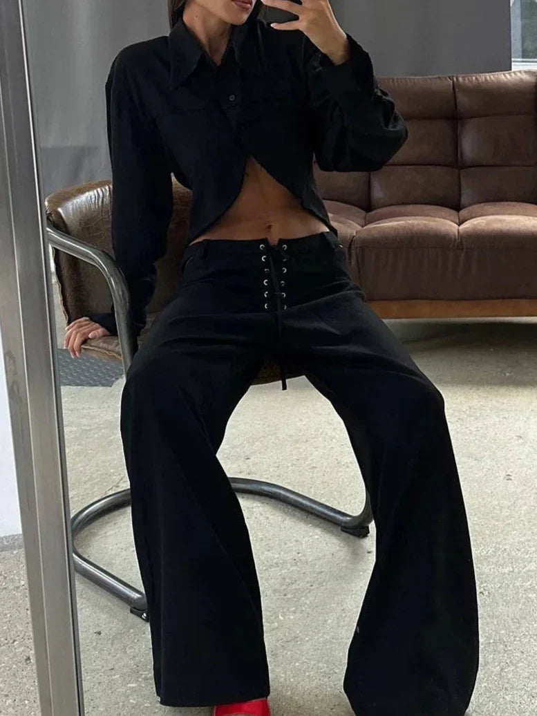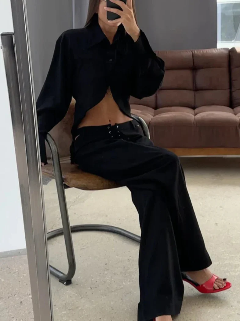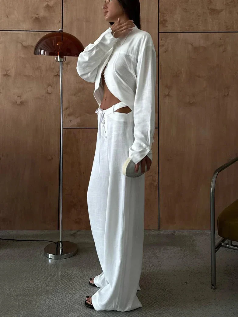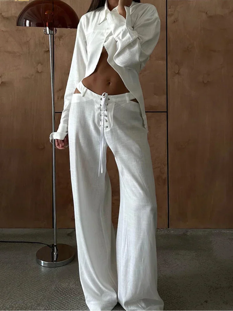 הסט הזה כולל חולצה מכופתרת עם שרוולים ארוכים ומכנסיים רחבים, הפריטים עשויים מחומרים איכותיים כמו כותנה וספנדקס