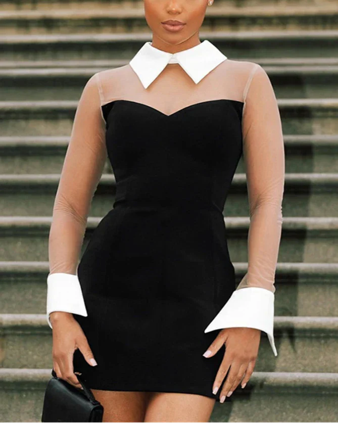 השמלה עשויה פוליאסטר עם אלסטיות גבוהה. גזרה צמודה עם מותן גבוהה, צווארון הפוך ושרוולים מלאים. עיצוב מינימליסטי באורך מיני, מתאימה לאירועים סקסיים ומועדונים.